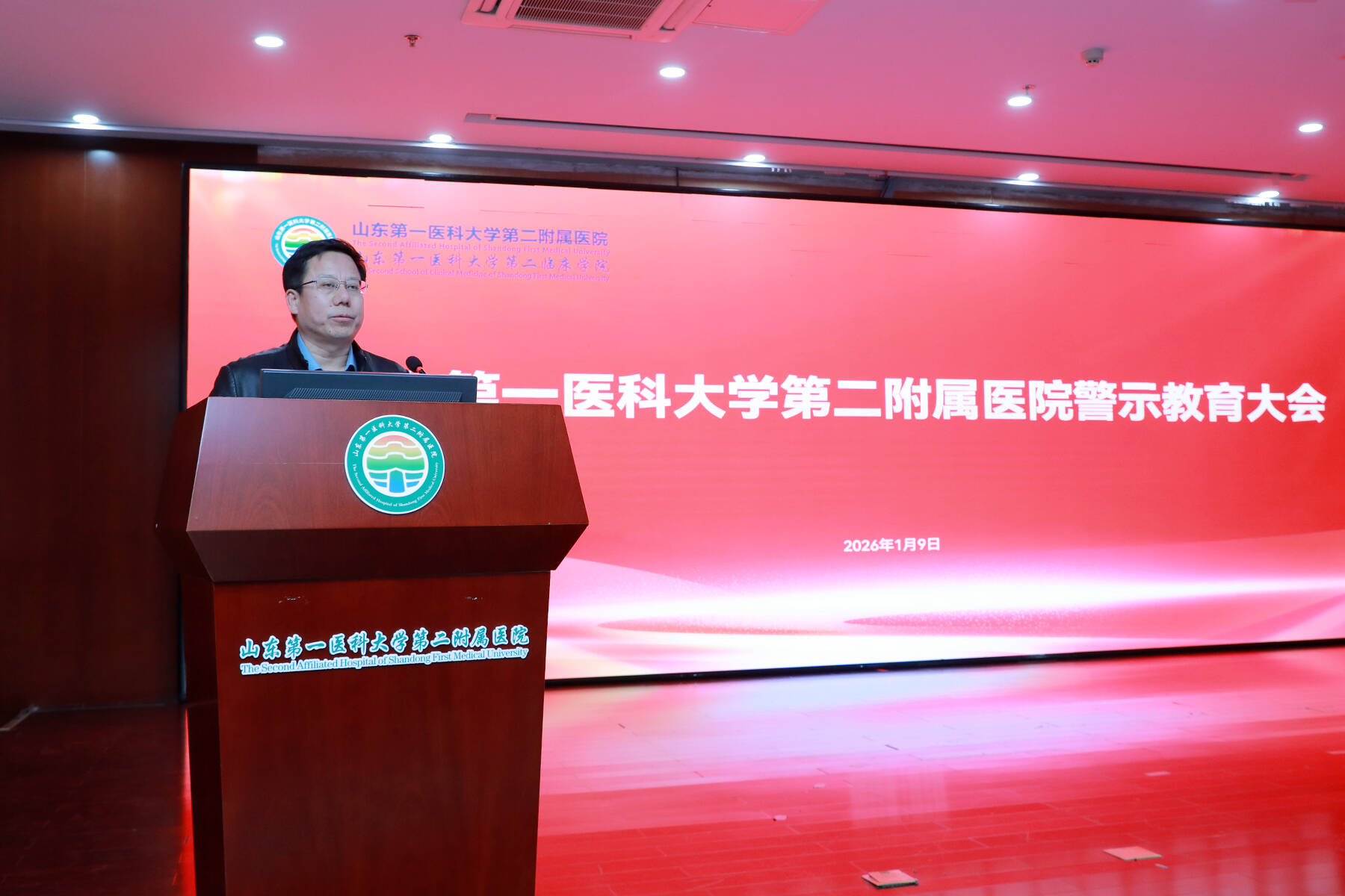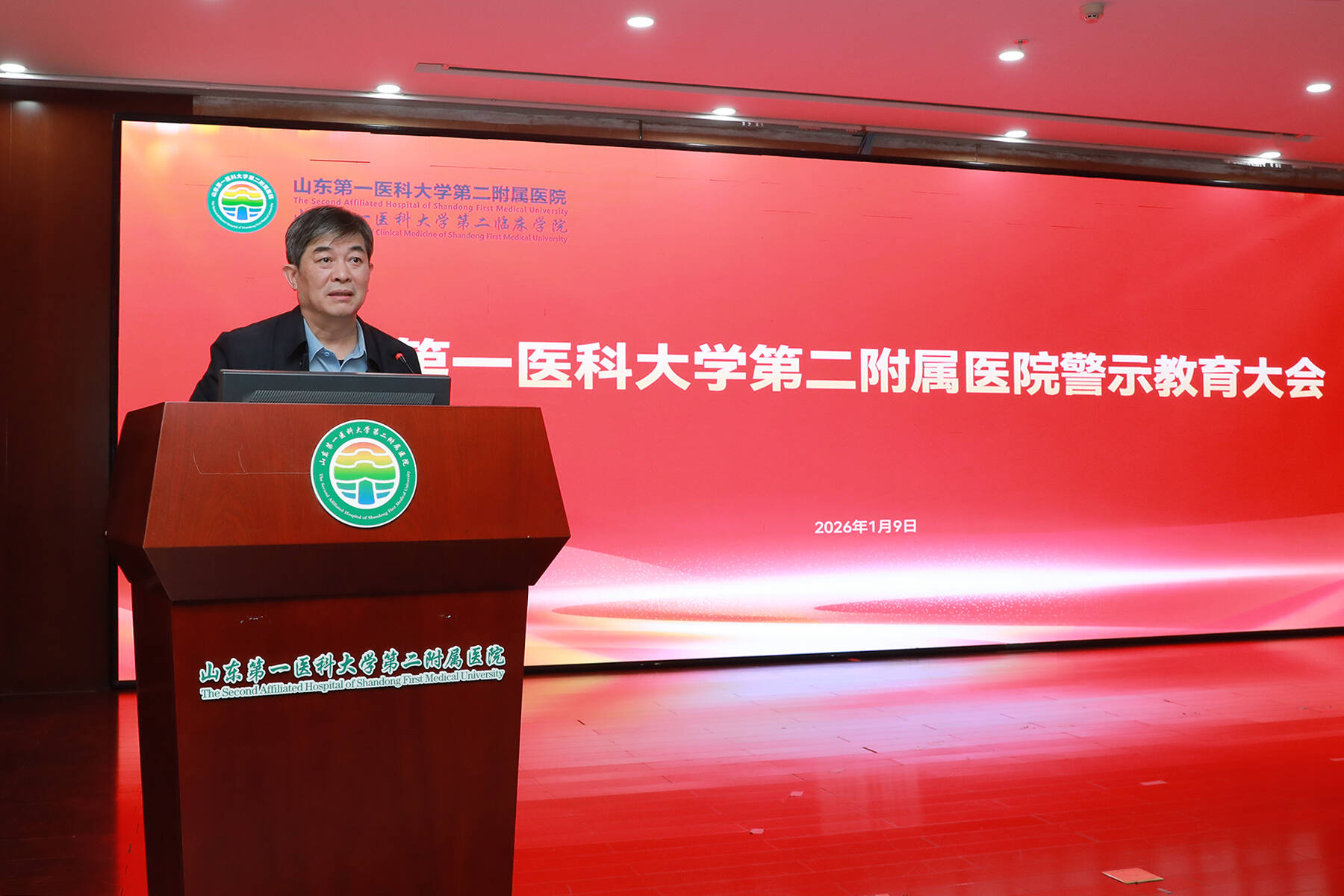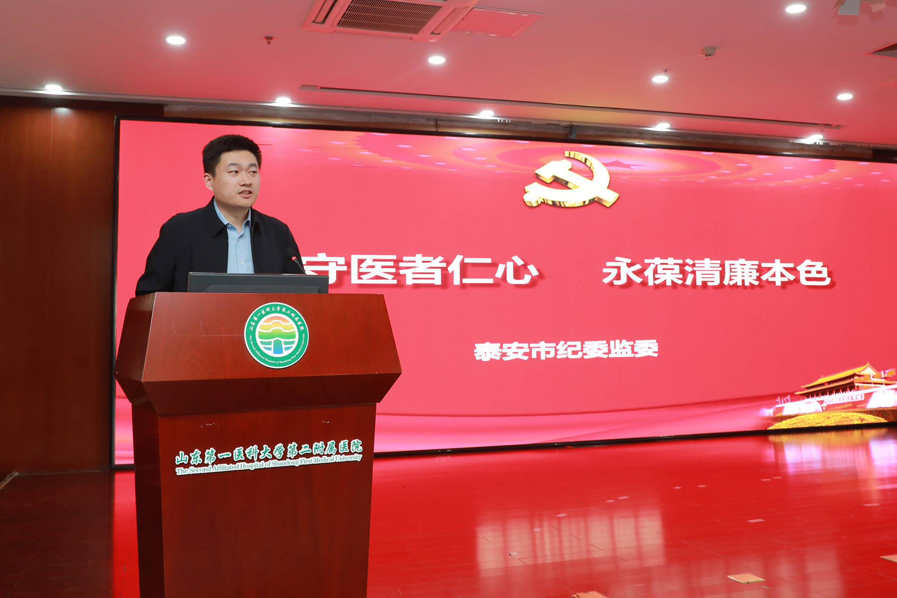 为贯彻落实校(院)党委党风廉政建设责任制工作要求和省卫生健康委关于开展全省医疗机构“五个一”活动部署,1 月 9 日下午,第二附属医院(第二临床学院)召开全院警示教育大会。本次会议通过专题讲座、警示教育片观看、总结讲话三个核心环节,层层递进展开。医院全体在家的院领导曹铭锋、肖强、张传新、刘伟、房振胜、刘志超、张伯平出席会议。会议特邀泰安市纪委监委党风政风监督室尹程杰主任授课。
